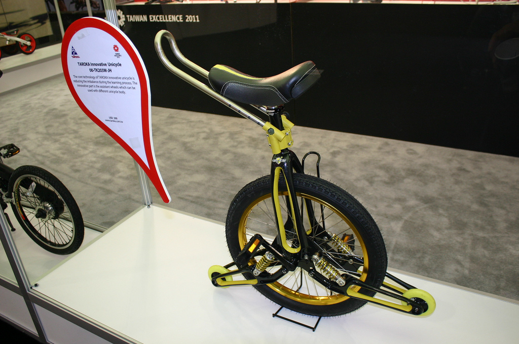 Being at the Gazelle/Yepp booth was a breath of fresh air though, especially since it was right there with Pashley, –complete with a genuine british dude who was the real deal and not an actor; Moulton, and the re-introduced Gerry Burgess line. The Dutch overall had a solid presence with Basil, Gazelle, and Yepp. Dutch ID was there, but in talking with them you couldn’t help but notice the lack of enthusiasm and eagerness to off-load their bikes on display for cheap so they didn’t have to haul them back. –No, Dutch bikes/commuter bikes/city bikes/utility bikes were not a trend at this year’s Interbike, even though in every major city (ie: the real world) they are gaining popularity at an alarming rate. There was a noticeable trend at the show however, toward small-wheel bikes–full size bikes with 20 inch wheels, in fixed gear, road, and commuter configurations. These spanned from the awesome $14,000 full stainless-steel Moulton to various $200 chinese fixed gear bikes in 1000 different colours. Surly had a strong presence with solid, affordable, and practical goods, and their Pugsley bike has spawned TONS of, (ok, at least 5) imitators, and these huge-tire bikes were everywhere!–who knew?–They do make it easier to ride over logs as was observable at the Surly booth sporting log rollers for people to test their skills on. Carbon fiber and steel seem to be the materials of choice these days, with less and less aluminum and titanium. Modern builders and companies also seem have developed a hatred for, or at least a severe disliking for straight, round cross-section frame tubes, or maybe there was a recent tubing bender sale worldwide that i missed out on. The ground level had the most interesting stuff, most notably were not one, but two! reintroductions of the Pedersen frame design, one with electric assist front hub motor; the Tortola Roundtail bikes, (no real reason to make a frame like that other than “hey! it’s Vegas–er, Interbike!, loosen up man!” …….; the Solowheel provided a great spectator sport; and the Circulus–a mini velodrome where you could show off or break your nose.